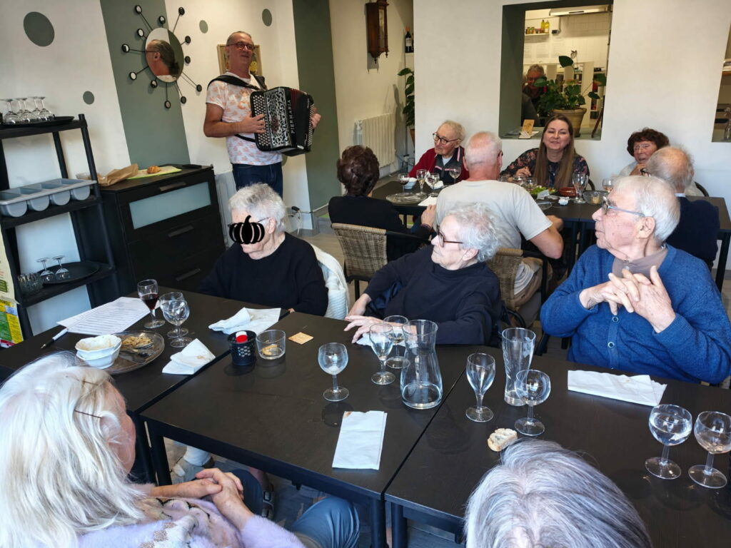 Avant tout, la surprise est arrivée en fin de repas. Puisque quelques airs d’accordéon ont accompagné ce moment, les résidents ont spontanément chanté. En bref, la musique a réveillé les souvenirs et les émotions. Ainsi, les voix se sont élevées avec joie et émotion.