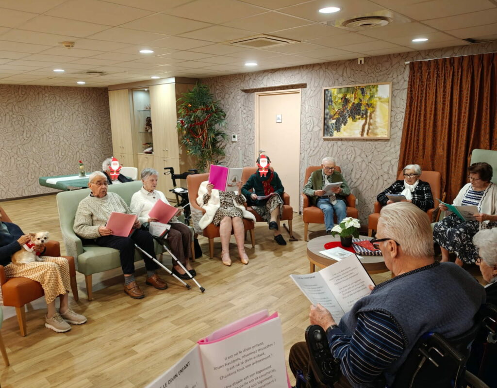 En premier lieu, les résidents se sont retrouvés près du sapin décoré et de la cheminée. D’une part, les chants traditionnels de Noël ont résonné dans la résidence. D’autre part, les voix se sont unies dans une atmosphère douce et apaisante. Ainsi, chacun a participé selon ses envies. En conséquence, cette veillée a favorisé l’émotion et la convivialité. Ces instants partagés renforcent le sentiment d’appartenance. Ils créent des souvenirs précieux au sein de l’ehpad Le Temps de Vivre à Grignols, apprécié pour son ambiance familiale et rassurante.